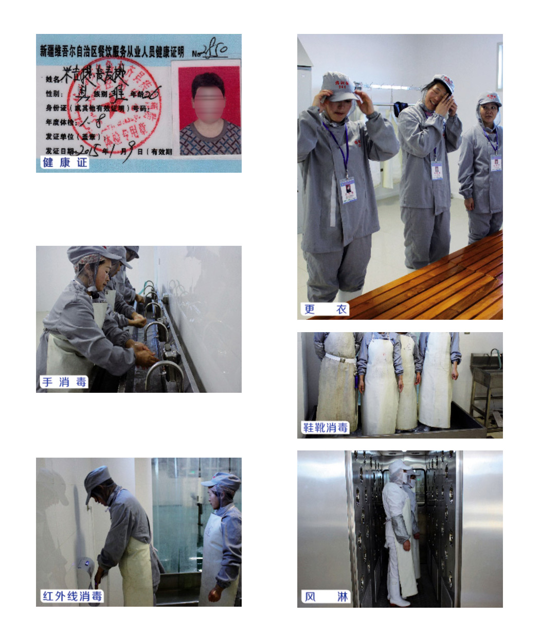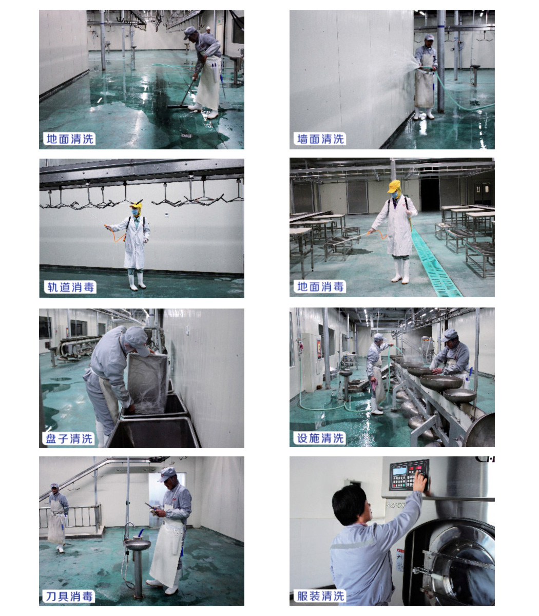 員工消毒 員工每天進入屠宰加工車間,必須進行嚴格的衛(wèi)生消毒,以確保食品安全衛(wèi)生。